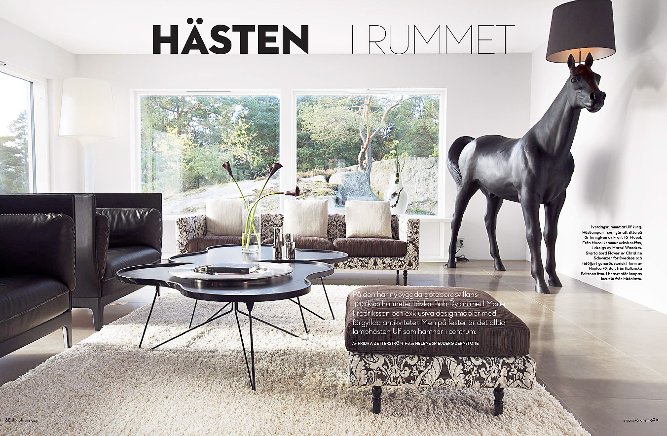 ”Jag ringde min bror och frågade om jag fick ställa en lampa tillfälligt hemma hos honom. Men brorsan var bortrest när hästen levererades så han blev aningen förvånad när han kom hem och hittade en häst i hallen, berättar mamman i familjen med ett skratt. Det har blivit värsta partytricket att sitta på Ulf.”