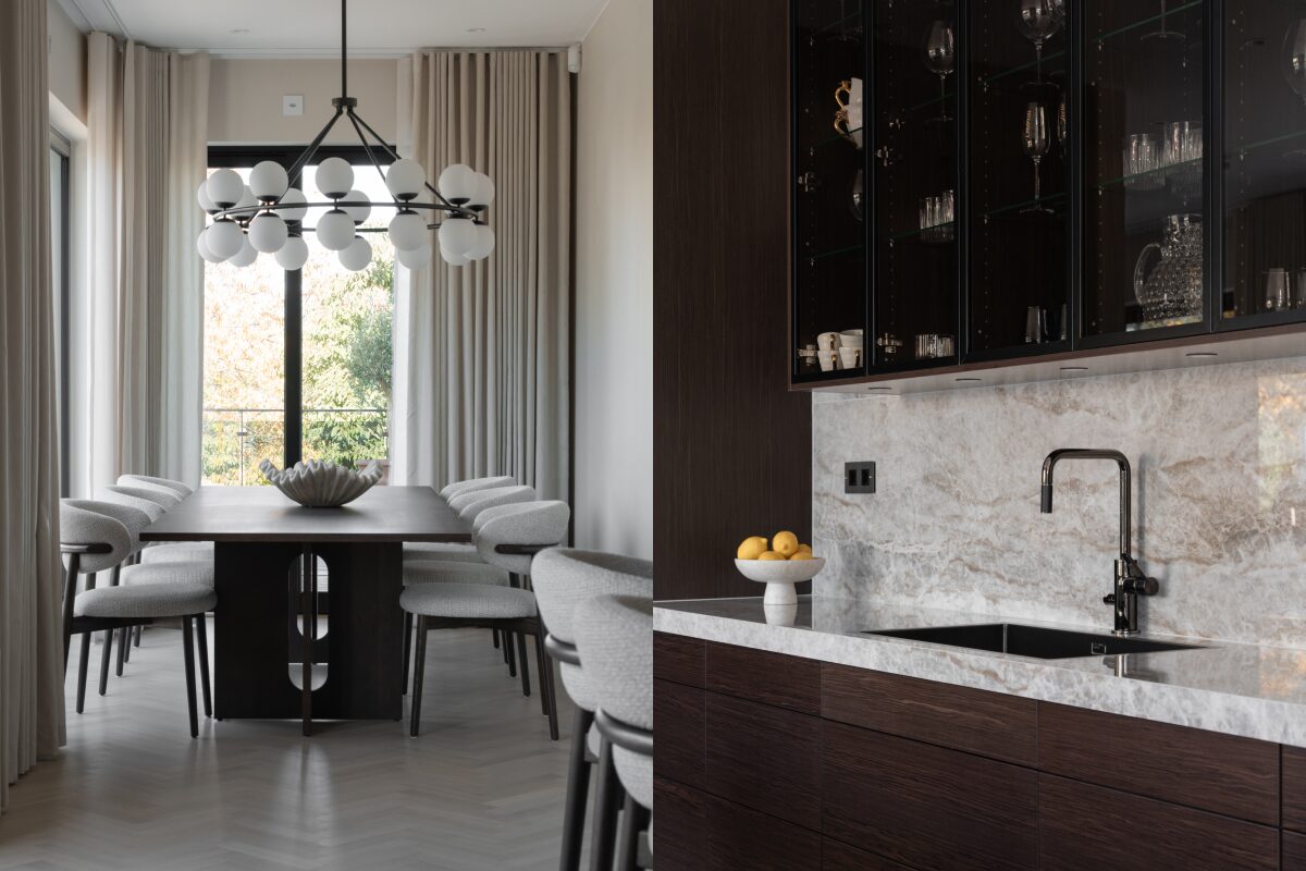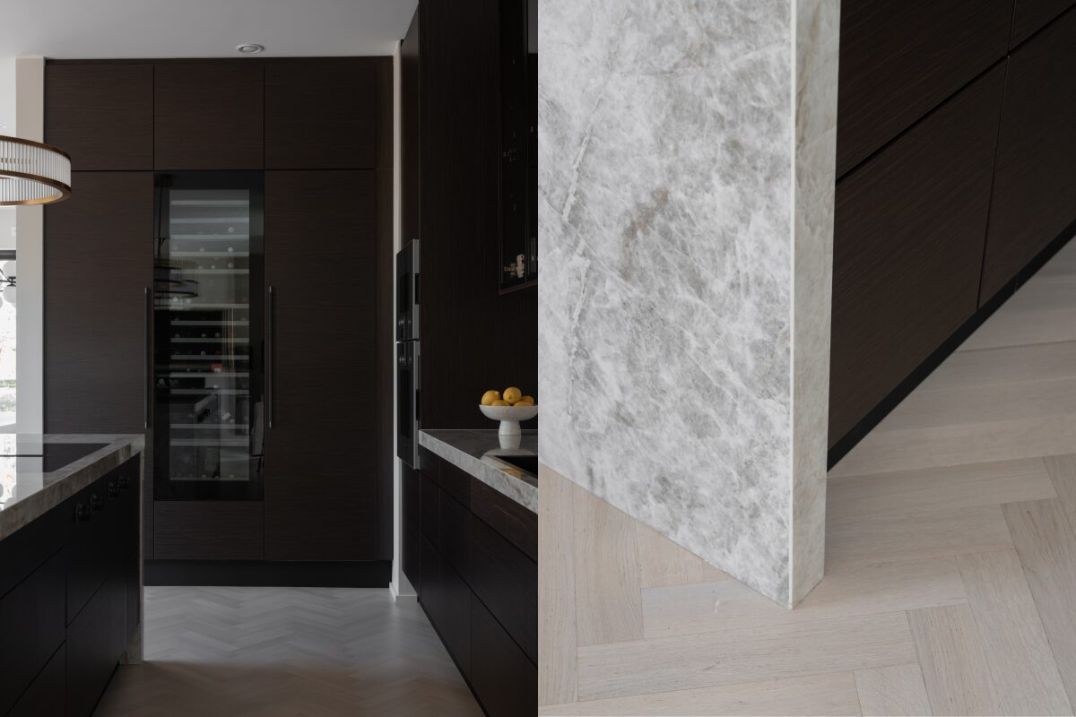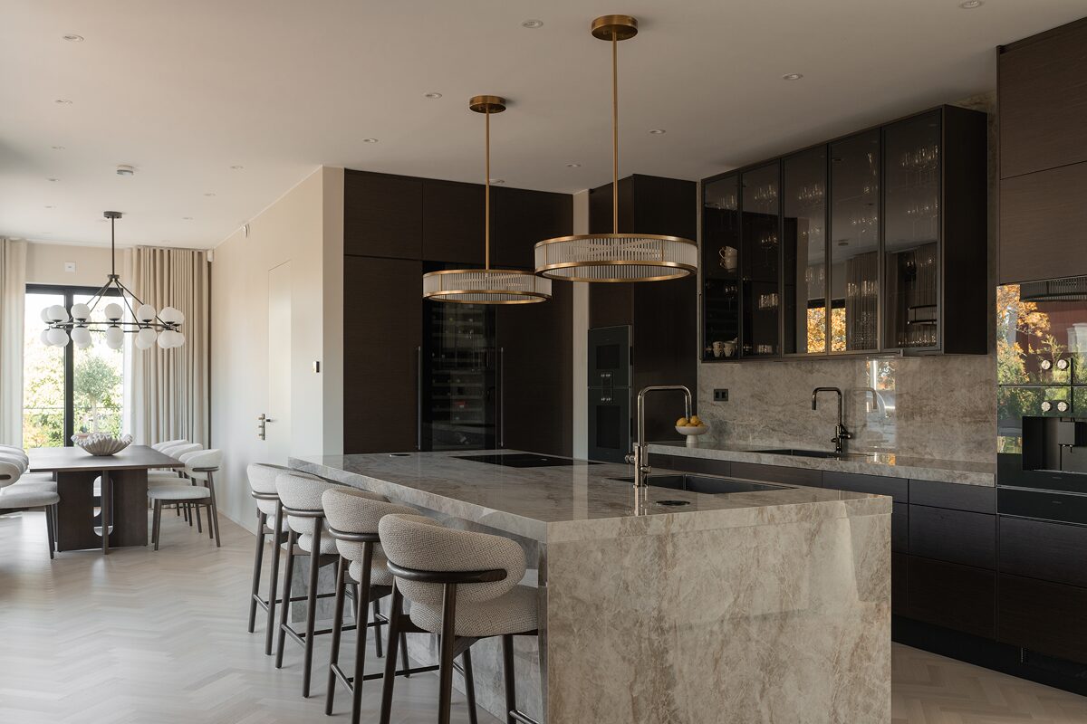 Alla materialval är gjorda med omsorg – natursten, exklusivt trä, tonade glasdetaljer och specialdesignade snickerier skapar en tidlös känsla. Köket, som är hjärtat i hemmet, är designat med fokus på funktion, estetik och kvalitet, och utrustat med premiumvitvaror i en planlösning som smälter samman med resten av huset.